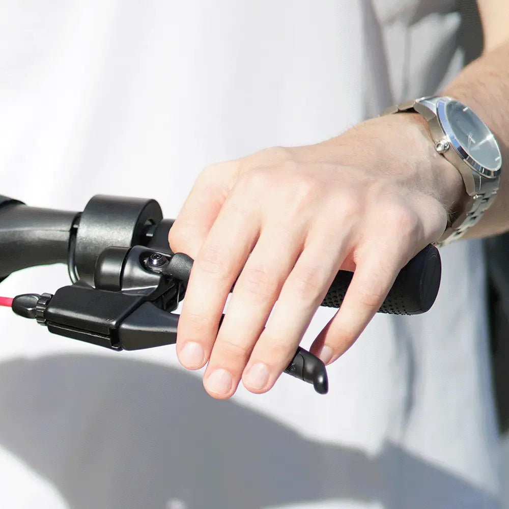4. Relâchez l'accélérateur et le système de récupération d'énergie cinétique (SREC) se met automatiquement en marche pour freiner doucement ; serrez le levier de frein pour un arrêt brusque.