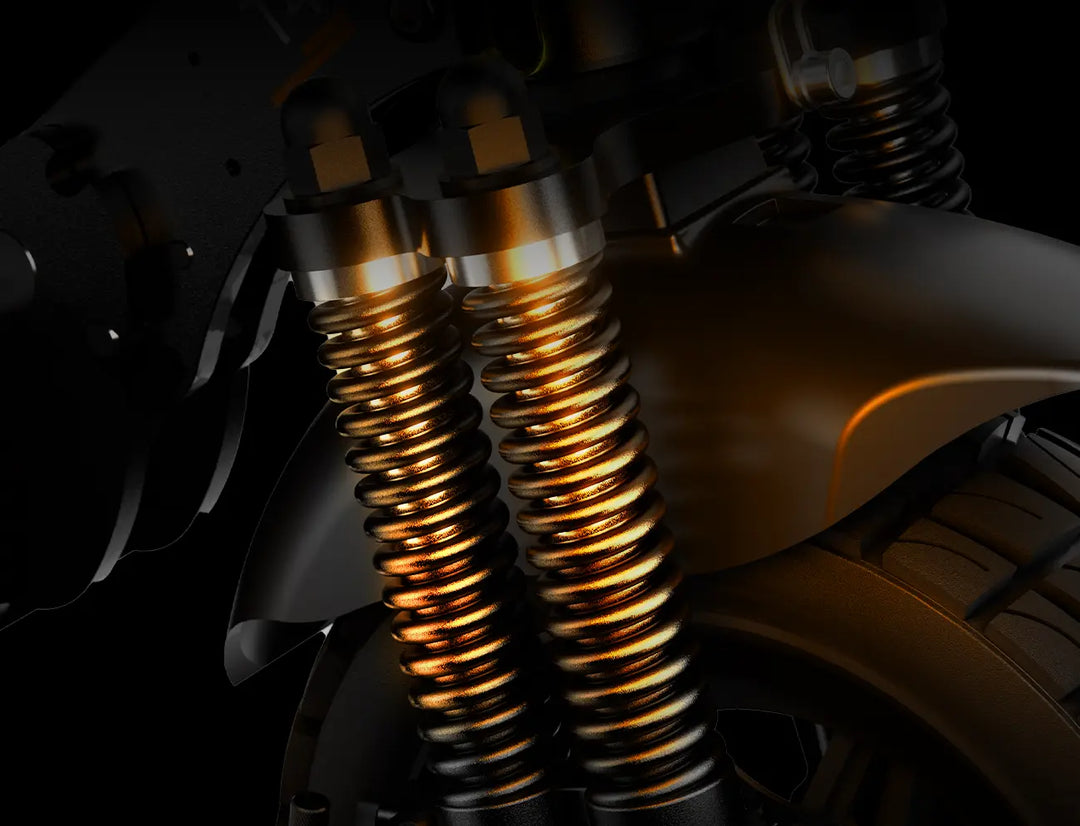 Front and rear suspension absorb bumps, ensuring a smooth and stable ride on any terrain.