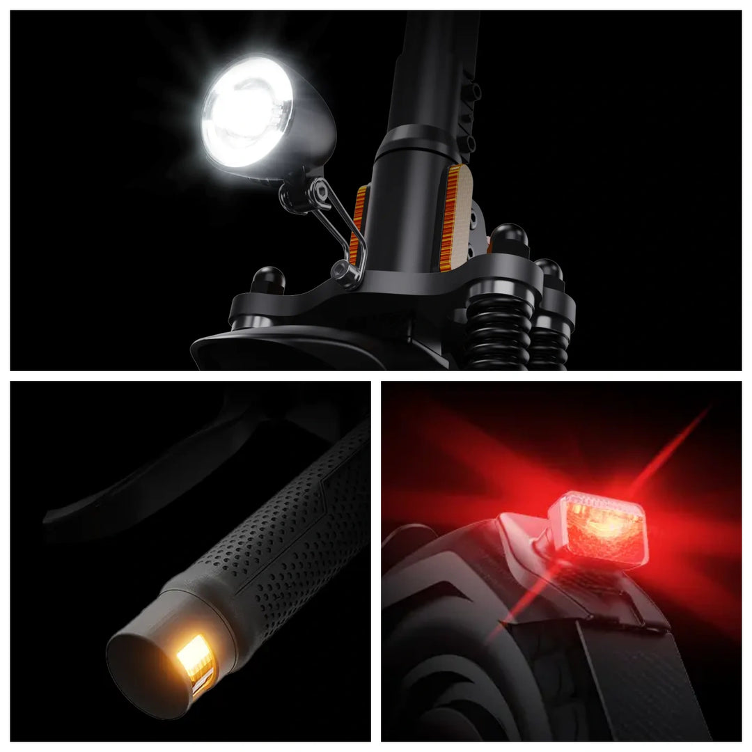 Front headlight, rear tail light, and turn indicators enhance visibility and safety in low-light conditions.