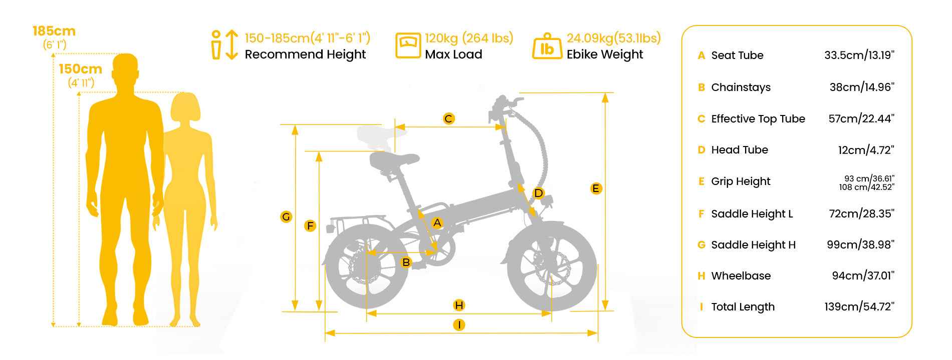 The recommended height for the U3 E-Bike is between 150 cm and 185 cm (4'11" ~ 6'1"). The maximum weight is 120 kg (264 lbs).